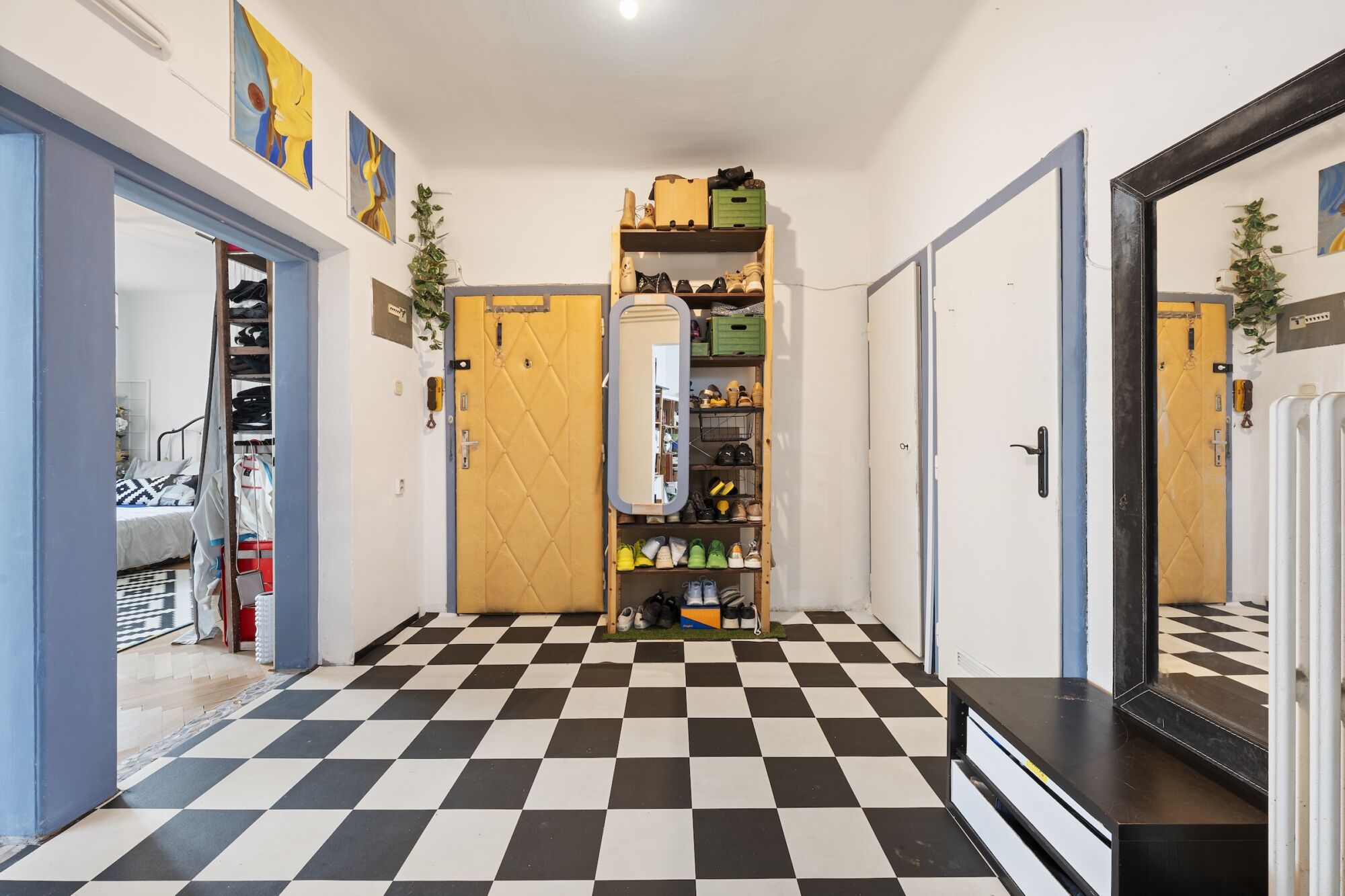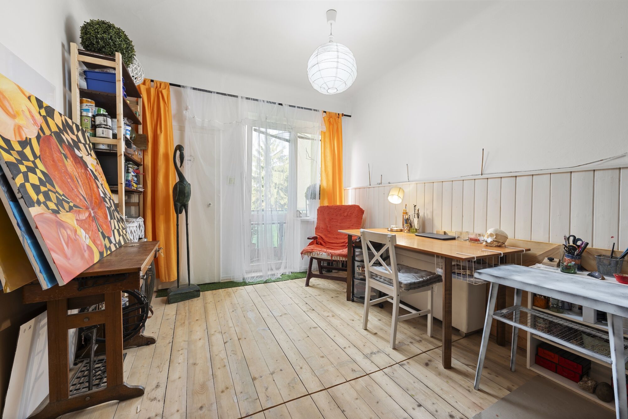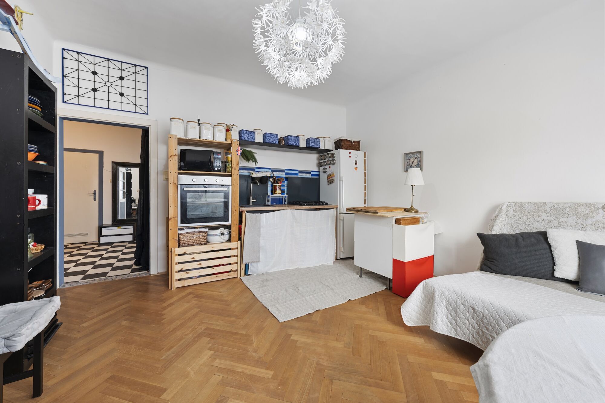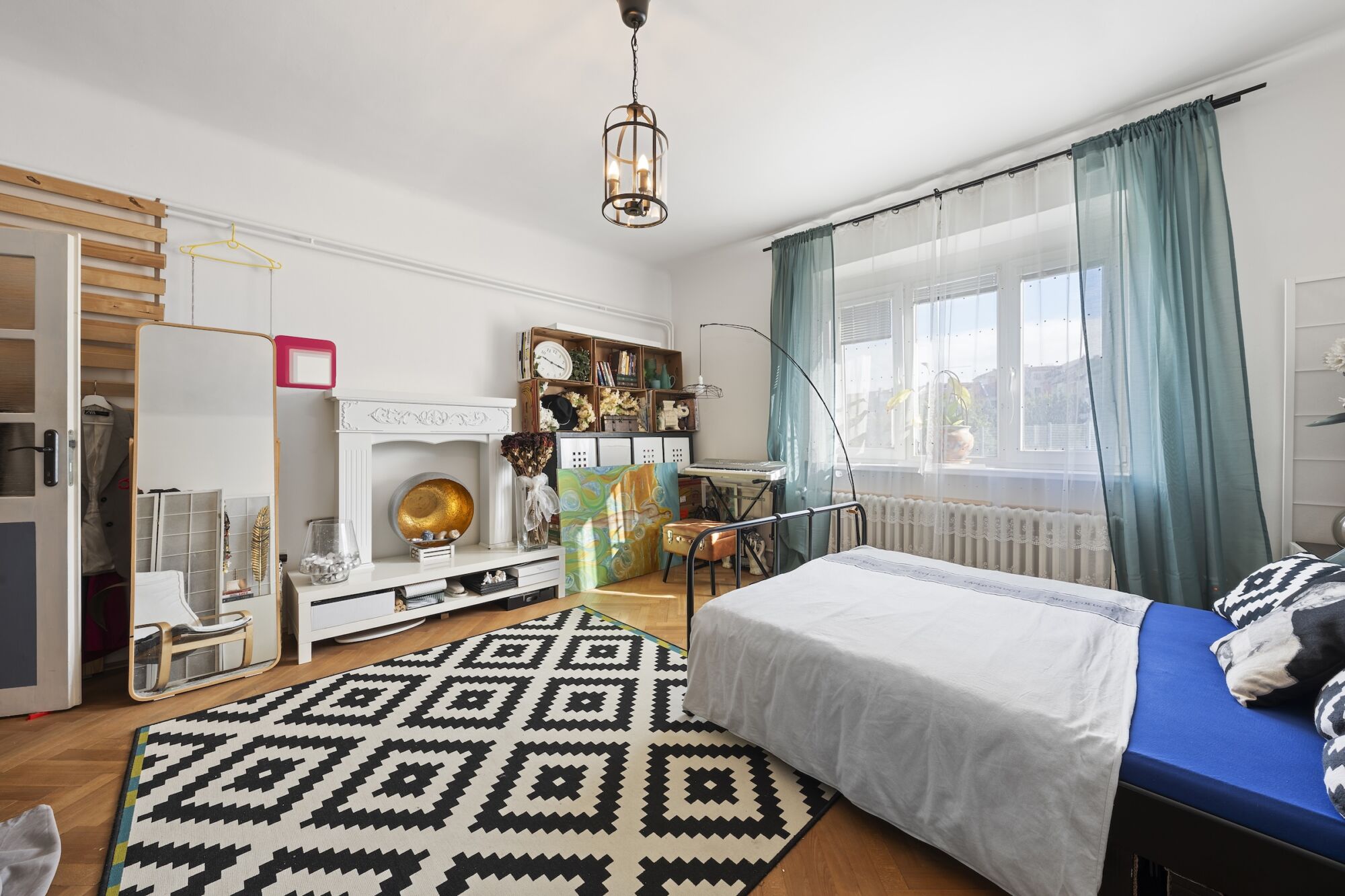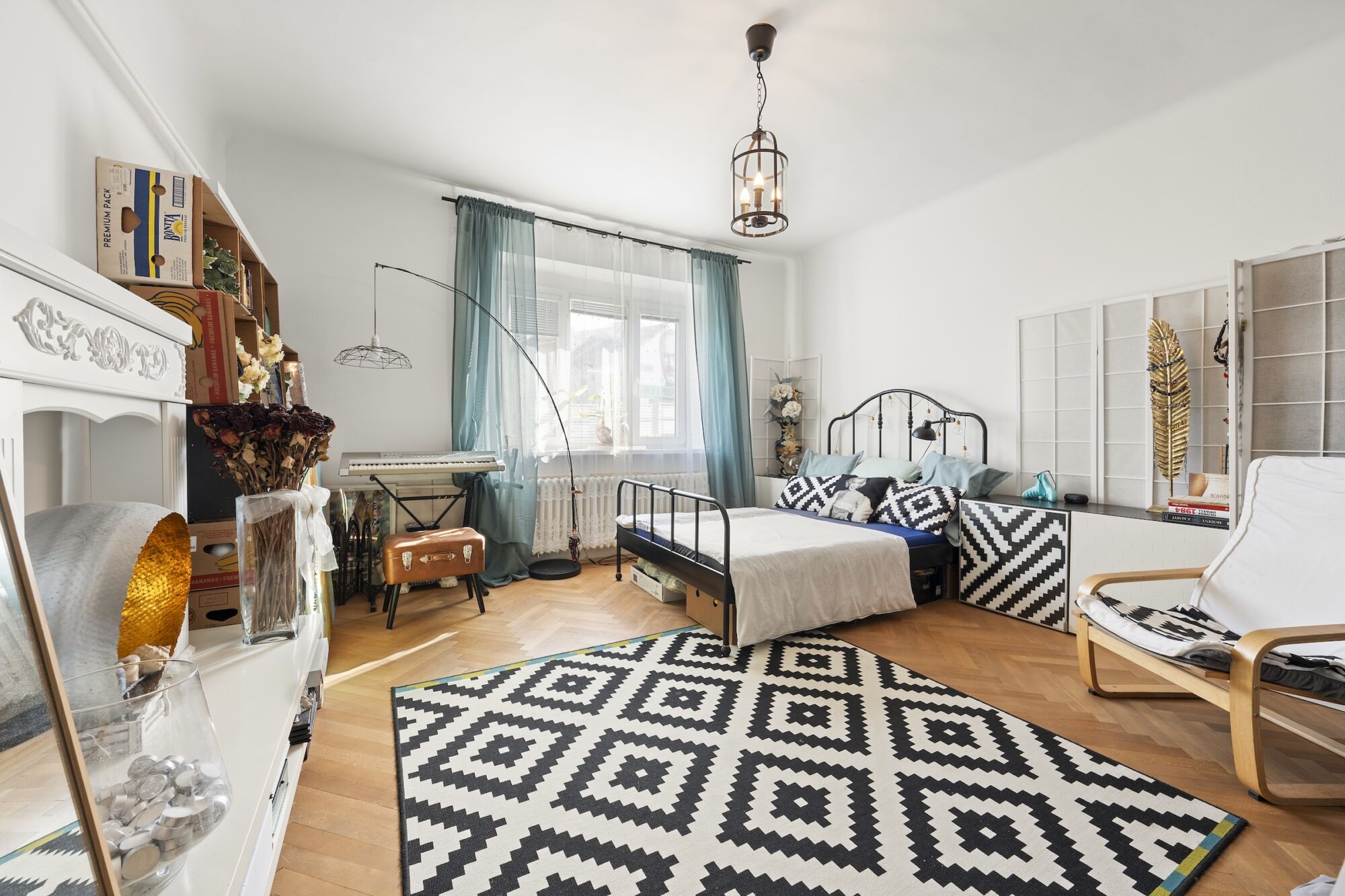Všechny pokoje jsou neprůchozí. K bytu náleží sklep v přízemí. Byt prošel v průběhu posledních let rekonstrukcí rozvodu vody, elektřiny, plynu a výměny oken. Výhodou je vlastní vytápění kombinovaným plynovým kotlem z roku 2024. Na podlahách jsou zachovalé parkety, dřevěné palubky a dlažba. Měsíční náklady jsou 5.400 Kč včetně FO. Rozměry místností: Pokoj s kk je 20m2, ložnice 20,5m2, pracovna 13,5m2, chodba 7.5m2, koupelna 6,5m2, WC 1m2, komora 1,2m, lodžie 2m2 a sklep 3m2. Celkem 75 m2.