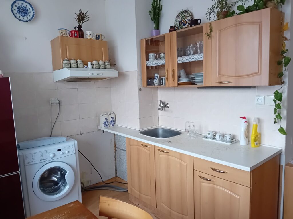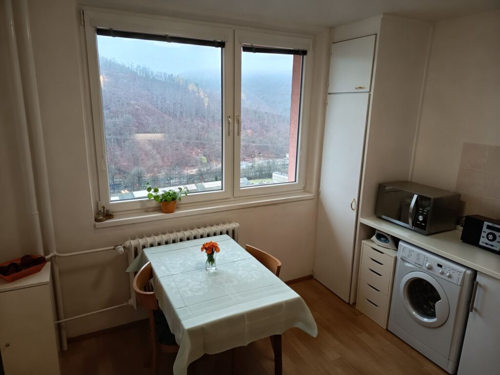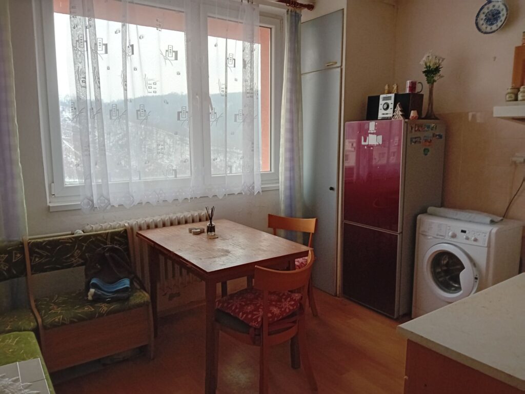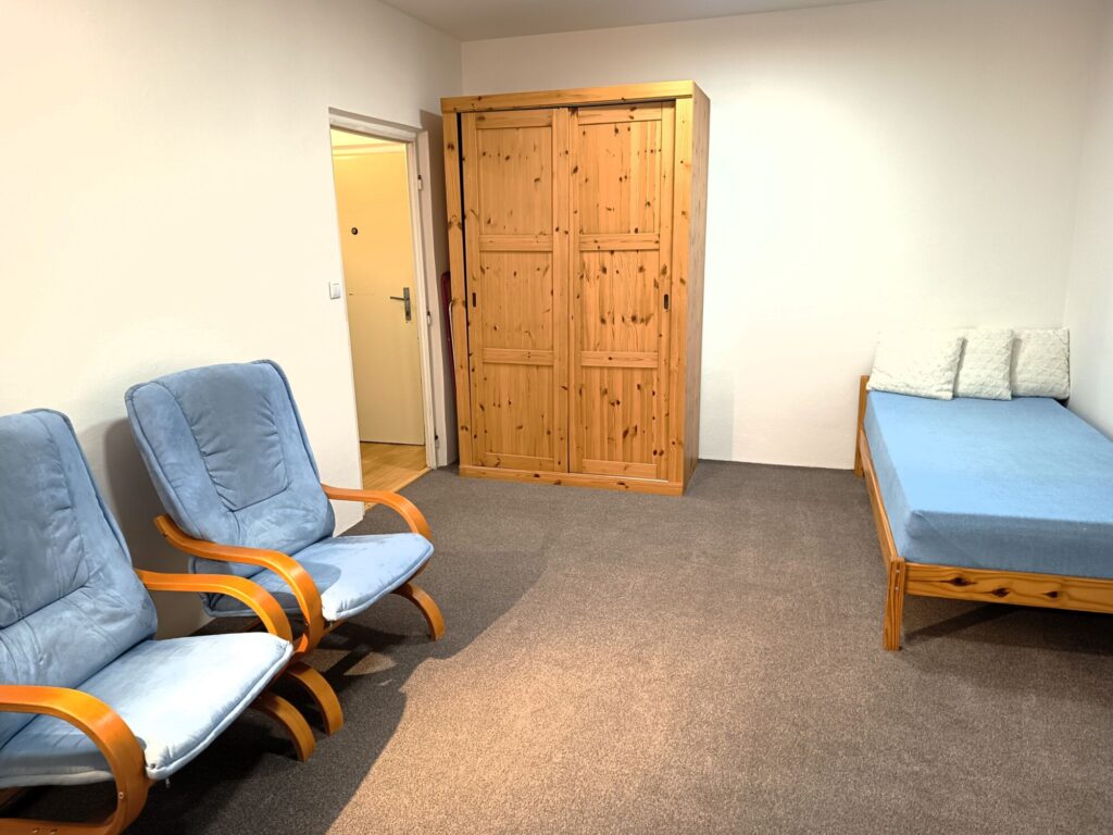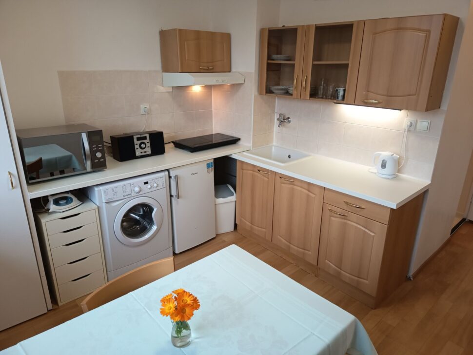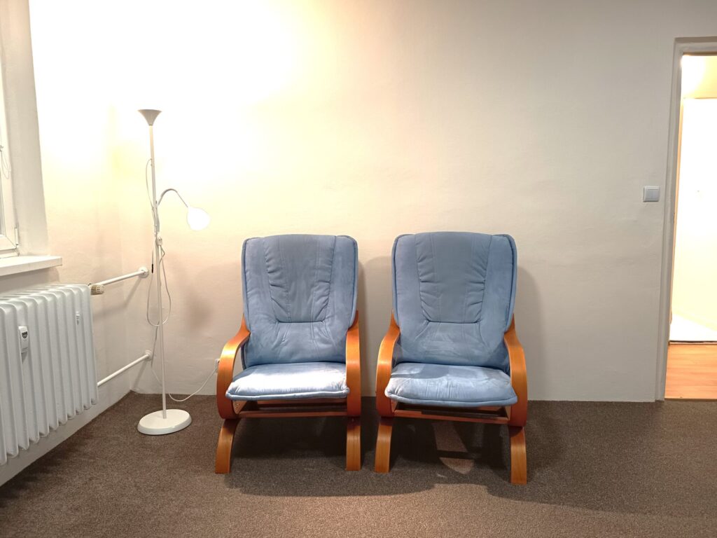 Krásně jsme se potkali i v movitých věcech. My jsme dodali skříň, postel, dvě křesla a lampu, a on má svoji televizní stěnu a konferenční stolek. Kuchyň je kompletně zařízená, včetně všech spotřebičů.
